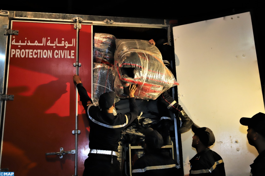 وعلم في عين المكان أنه تم، في مستودع الوقاية المدنية بالعرجات (سلا)، تعبئة سبع شاحنات محملة بالأغطية وأسرة المخيمات ومعدات الإضاءة، من أجل تقديم المساعدات الإنسانية في أسرع وقت ممكن إلى سكان المناطق المنكوبة.